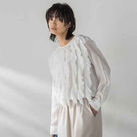 繊細な生地のフリル端を断ち切りにして洗いをかけ、ラフさを加えた華やかな一枚。