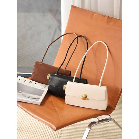 カッチリとしたスクエアフォルムに、ゴールドのメタルプレートが上品な印象のバッグ。長めのワンハンドルデザインで、肩掛けがしやすいのも嬉しいポイントです。スタイリングを選ばず、デイリーからフォーマルなシーンまで幅広く活躍するアイテムです。
