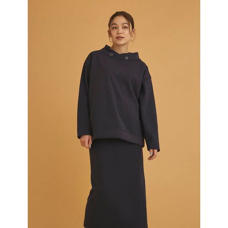 スタンドカラーのプルオーバーと、Iラインシルエットのスカートのセットアップ。ゆったりとしたシルエットで、リラックス感のある着心地も魅力的なポイントです。それぞれ単品でも使えるので、さまざまなスタイリングが楽しめるアイテムです。