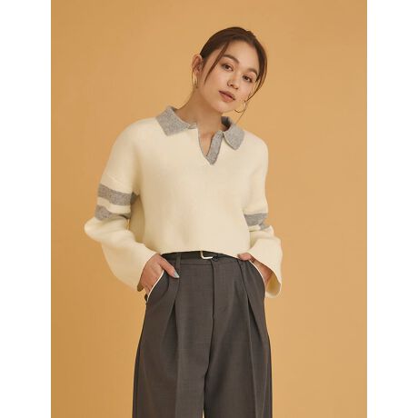 袖のダブルラインがアクセントになった襟付きニット。肩が落ちたゆったりとしたシルエットと、スキッパーネックが抜け感のある着こなしを演出します。すっきりとしたショート丈で、ハイウエストのボトムスともバランス良く合わせられるアイテムです。
