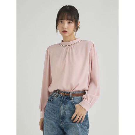 なめらかで落ち感のある素材が上品な印象のブラウス。ネックにあしらわれたパールデザインが女性らしく、華やかな雰囲気をプラスしてくれます。きれいめなスタイルにはもちろん、デニムパンツと合わせたカジュアルなスタイリングもおすすめです。