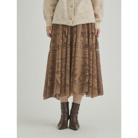 繊細なレースを使用した、エレガントな雰囲気のロング丈スカート。ほどよい透け感と、ふんわりと広がるシルエットが女性らしさを引き立ててくれます。ウエスト部分はゴム仕様になっているので、ストレスフリーな穿き心地も嬉しいポイントです。