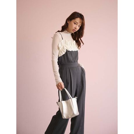 胸元にあしらわれたフリルデザインがポイントのキャミオールインワン。華奢なストラップが、女性らしさを引き立ててくれます。一枚で着用するのはもちろん、インナーにカットソーやブラウスを合わせたり様々なスタイリングが楽しめるアイテムです。