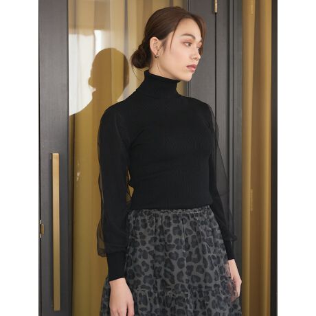 袖に重ねたチュールがフェミニンなタートルニットトップス