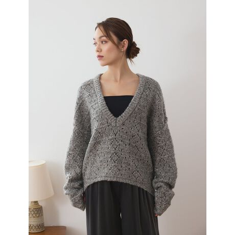 表情のある透かし編みデザインが目を惹く長袖ニット。肩が落ちたゆったりとしたシルエットに、深めに開いたVネックが抜け感のある着こなしを演出します。インナーにカットソーやシャツを合わせたり、さまざまなスタイリングが楽しめるアイテムです。