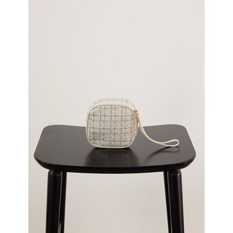 クラシカルな雰囲気のツイード生地が上品な印象のスクエアポーチ。大きく開くファスナーで出し入れがしやすく、ストラップが付いているのも嬉しいポイントです。コスメやアクセサリーなどの小物を入れたり、マルチに活躍してくれるアイテムです。