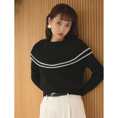 コンパクトな身頃に、二枚重ねたボリュームのあるケープデザインが印象的な長袖のニットプルオーバー。配色で効かせたラインが、アクセントをプラスします。パンツにもスカートにも合わせやすく、幅広いスタイリングに活躍してくれるアイテムです。