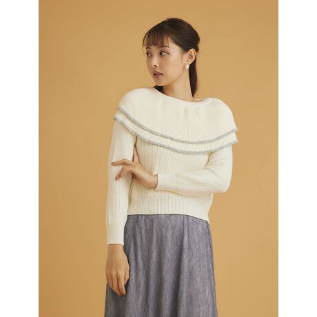 コンパクトな身頃に、二枚重ねたボリュームのあるケープデザインが印象的な長袖のニットプルオーバー。配色で効かせたラインが、アクセントをプラスします。パンツにもスカートにも合わせやすく、幅広いスタイリングに活躍してくれるアイテムです。
