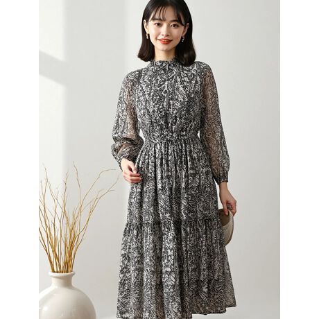 襟やフロントに施したフリルがフェミニンな雰囲気を演出する、ロング丈の長袖プリントワンピース。ウエストのリボンが、シルエットにメリハリをプラスしてくれます。一枚でスタイリングが決まり、デイリーからお出かけまで幅広いシーンで活躍するアイテムです。