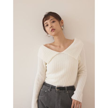 存在感のあるビッグカラーデザインが目を惹く長袖ニットトップス。程よくボディにフィットするシルエットと、首元の開きが女性らしい着こなしを演出します。一枚ではもちろん、ジャンパースカートやサロペットのインナーとしても活躍するアイテムです。