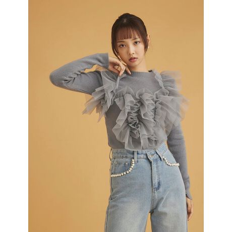 ボリュームのあるチュールフリルが印象的な長袖ニットプルオーバー。程よくボディにフィットするシルエットが、女性らしさを引き立てます。カジュアルなデニムにもフェミニンなスカートにも合わせやすく、様々なスタイリングが楽しめるアイテムです。