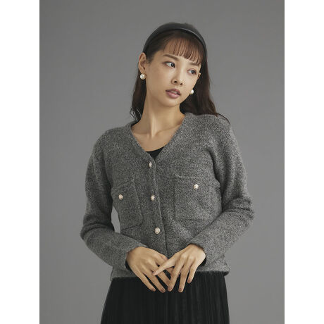 コンパクトなシルエットが女性らしい印象のVネックの長袖カーディガン。シンプルながらも、フロントや胸元のポケットにあしらわれたゴールドのボタンがアクセントをプラスしてくれます。どんなボトムスとも合わせやすく、幅広いスタイリングに活躍するアイテムです。