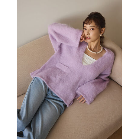 深めのVネックが抜け感を演出するアルパカタッチニット