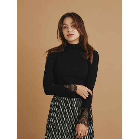 レースを施した袖が女性らしいハイネックニットプルオーバー