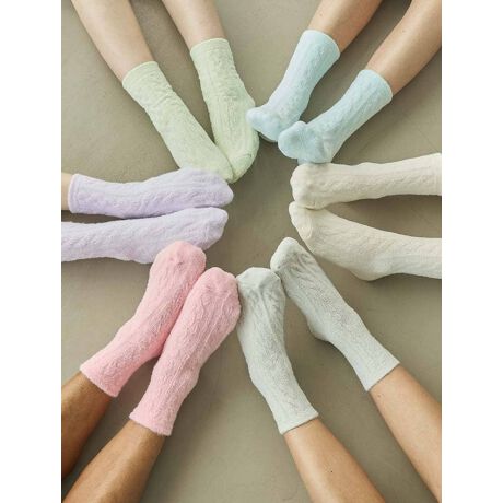 ふっくらとした立体感のあるケーブル柄が目を惹く、クルー丈のニットソックス。ふんわりとした柔らかな素材で、足元を優しく包み込んでくれます。おうちでのリラックスタイムにもぴったりで、さまざまなシーンで活躍してくれるアイテムです。