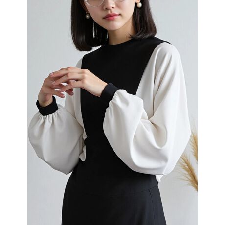 ブラウスを合わせたようなドッキングデザインが印象的なニット。ボリュームのある袖と、袖口と裾のリブでメリハリを効かせたシルエットが女性らしい着こなしを演出します。パンツにもスカートにも合わせやすく、様々なスタイリングが楽しめるアイテムです。