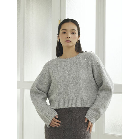 キラキラと輝くビジューを散りばめた、華やかな印象のドルマンニット。ゆったりとしたシルエットに、サイドのスリットが抜け感のある着こなしを演出します。短めの丈感なので、ハイウエストのボトムスともバランス良く合わせられるアイテムです。