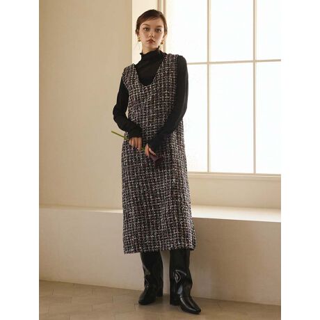 表情のあるミックスツイード生地を使用したジャンパースカート。前後に開いたVネックと、裾に向かってゆるやかに広がるシルエットが女性らしさを演出します。インナーにカットソーやブラウスを合わせたり、様々な着こなしが楽しめるアイテムです。
