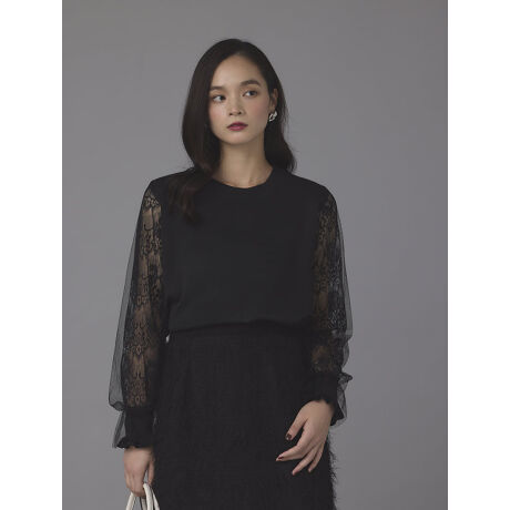 シアーなチュールを重ねたレーススリーブが目を惹くニット。レースの程よい透け感が、女性らしさを引き立ててくれます。フェミニンなスカートにはもちろん、カジュアルなデニムパンツとも合わせやすく様々なスタイリングが楽しめるアイテムです。