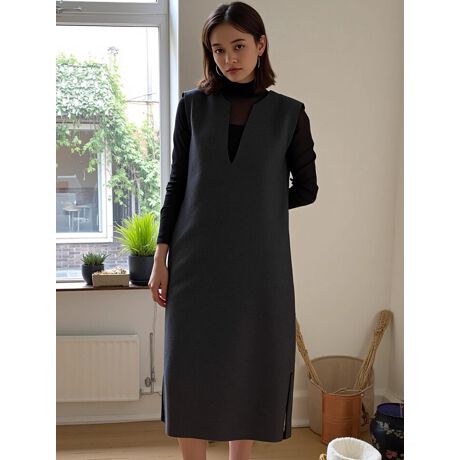 すっきりと開いた深めのVネックデザインが印象的なジャンパースカート。裾にかけて広がるシルエットが女性らしく、サイドに施したスリットが抜け感をプラスします。インナーにカットソーやブラウスを合わせたり、様々なスタイリングが楽しめるアイテムです。