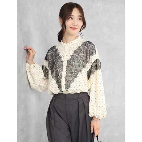 上品なレースの切り替えデザインが印象的なブラウス。バックに施したギャザーや、ふんわりとした袖が女性らしい雰囲気を演出します。合わせるボトムスを選ばず、カジュアルからきれいめまで幅広いスタイリングに活躍してくれるアイテムです。