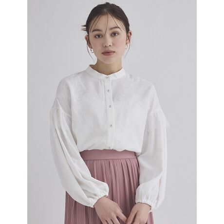 上品なレースの切り替えデザインが印象的なブラウス。バックに施したギャザーや、ふんわりとした袖が女性らしい雰囲気を演出します。合わせるボトムスを選ばず、カジュアルからきれいめまで幅広いスタイリングに活躍してくれるアイテムです。