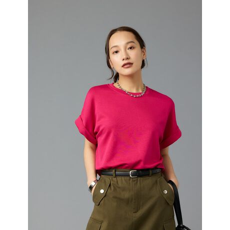 柔らかな肌触りとゆったりとしたシルエットで、着心地の良さも抜群なクルーネックTシャツ。シンプルながらも、袖の折り返しデザインがこなれ感のある着こなしを演出します。合わせるボトムスを選ばず、幅広いスタイリングに活躍するアイテムです。