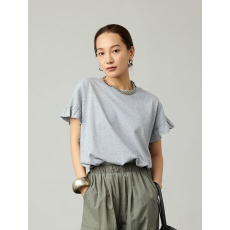 袖のフリルが女性らしい印象のクルーネックTシャツ。ゆったりとしたシルエットで、リラックス感のある着心地も魅力です。カジュアルなデニムやフェミニンなスカートなど様々なボトムスと合わせやすく、幅広いスタイリングが楽しめるアイテムです。