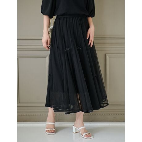 ほどよい透け感のあるチュールにリボンをあしらったスカート。裾に向かってふんわりと広がるフレアシルエットが、フェミニンな雰囲気を演出します。ウエスト部分はゴム仕様になっているので、ストレスフリーな穿き心地も嬉しいポイントです。