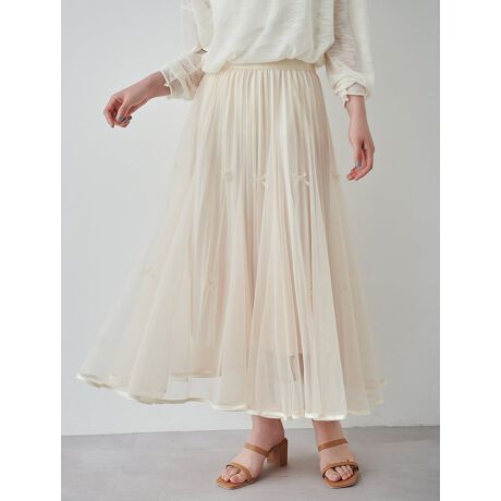 ほどよい透け感のあるチュールにリボンをあしらったスカート。裾に向かってふんわりと広がるフレアシルエットが、フェミニンな雰囲気を演出します。ウエスト部分はゴム仕様になっているので、ストレスフリーな穿き心地も嬉しいポイントです。