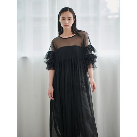 シアー感のあるチュール生地で仕立てたワンピース。ボリュームのあるフリルスリーブと、ふんわり広がるフレアシルエットがフェミニンな雰囲気を演出してくれます。カジュアルなデニムパンツなどと合わせた、レイヤードスタイルもおすすめです。