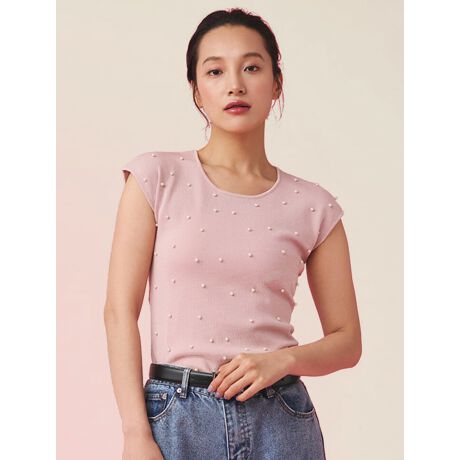 フロントに散りばめられたパールがアクセントをプラスするニットトップス。コンパクトなシルエットが、女性らしさを引き立ててくれます。すっきりとした丈感でパンツにもスカートにも合わせやすく、さまざまなスタイリングが楽しめるアイテムです。