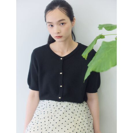 シンプルながらもゴールドのボタンがアクセントになった、半袖のサマーニットカーディガン。羽織りとしても一枚着としても使えて、着回し力も抜群です。合わせるボトムスを選ばず、カジュアルからきれいめまで幅広いスタイリングに活躍するアイテムです。