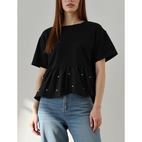 パールがアクセントをプラスするぺプラムトップス
