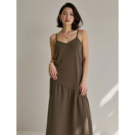 斜めのギャザー切り替えデザインが印象的なキャミソールワンピース。華奢なストラップと、ふんわりと広がるシルエットが女性らしさを演出します。一枚で着用するのはもちろん、インナーや羽織りをプラスしたり様々な着こなしが楽しめるアイテムです。