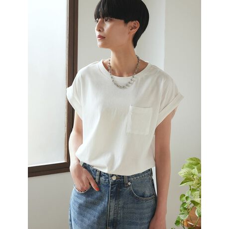 シンプルながらも、フロントのポケットがアクセントになった天竺Tシャツ。袖のロールアップデザインが、こなれ感を演出します。合わせるボトムスを選ばず、一枚着としてもレイヤードのインナーにも幅広いスタイリングに活躍してくれるアイテムです。