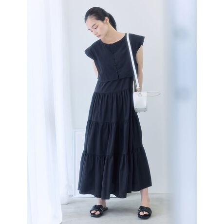 [型番:ES24S0141]2wayで着こなしが楽しめるティアードワンピースショート丈のトップスがセットになった、ノースリーブのワンピース。裾に向かってふんわりと広がるティアードデザインが、フェミニンな雰囲気を演出します。セットで着用するのはもちろん、それぞれ別々でも使えて2wayで着こなしが楽しめるアイテムです。------------------透け感:ややあり生地の厚さ:薄手裏地:なし伸縮性:なしポケット:-------------------