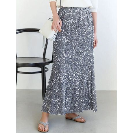 キラキラと輝くスパンコールが華やかな印象のスカート。上品なロング丈で、裾に向かってゆるやかに広がるシルエットが女性らしさを演出します。シンプルなトップスと合わせるだけでサマになり、スタイリングの主役になること間違いなしのアイテムです。
