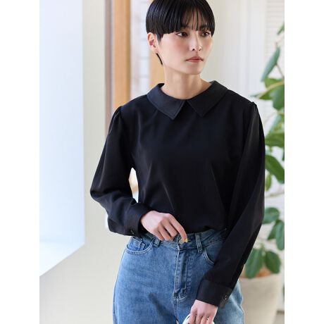 さらりとした落ち感のある素材に、襟付きデザインが上品な印象のブラウス。ギャザーを入れてふんわりとさせた袖が、女性らしい雰囲気を演出します。合わせるボトムスを選ばず、カジュアルからきれいめまで幅広いスタイリングに活躍するアイテムです。