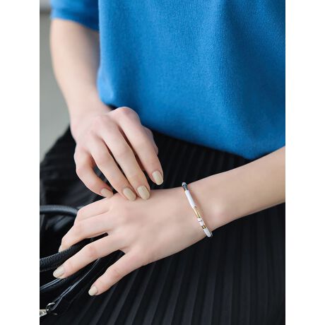 シンプルなフープをバイカラーデザインで印象的に仕上げたブレスレット。すっきりとしたシルエットながら存在感があり、手元にアクセントをプラスしてくれます。カジュアルからきれいめまで様々なスタイルに合わせやすく、幅広いシーンで活躍する一品です。