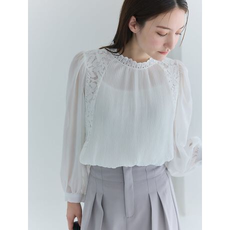 繊細なレース×プリーツデザインがフェミニンな雰囲気を演出するシフォンブラウス。ほどよい透け感が、女性らしさを引き立たせてくれます。レディなスカートに合わせるのはもちろん、デニムパンツと合わせたカジュアルな着こなしもおすすめです。