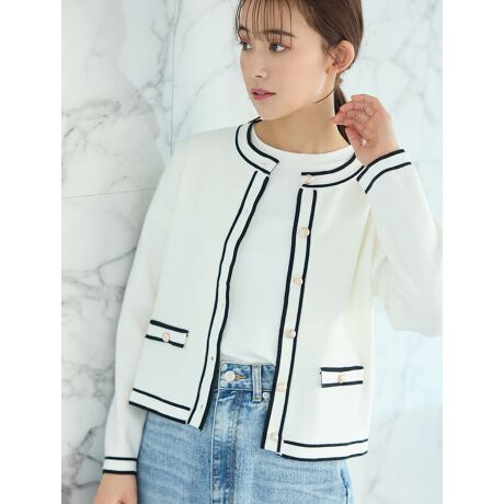 配色で効かせたラインがアクセントになった、クルーネックのカーディガン。羽織りとしてはもちろん、フロントのボタンをすべて留めてプルオーバー風の着こなしも楽しめます。合わせるボトムスを選ばず、幅広いスタイリングに活躍するアイテムです。