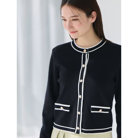 配色で効かせたラインがアクセントになった、クルーネックのカーディガン。羽織りとしてはもちろん、フロントのボタンをすべて留めてプルオーバー風の着こなしも楽しめます。合わせるボトムスを選ばず、幅広いスタイリングに活躍するアイテムです。