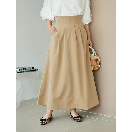 フロントに施したタックが立体感のあるシルエットを演出するフレアロングスカート。ハイウエストのデザインで、スタイルアップして見えるのも嬉しいポイントです。合わせるトップスを選ばず、さまざまなスタイリングが楽しめるアイテムです。