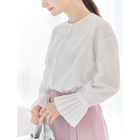 袖のプリーツデザインが女性らしい印象のブラウス。程よくゆとりを持たせたシルエットに、前後差をつけた着丈バランスがこなれ感のある着こなしを演出します。パンツにもスカートにも合わせやすく、幅広いスタイリングに活躍するアイテムです。
