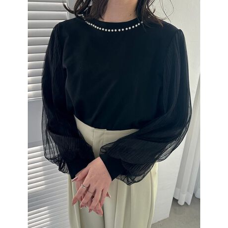 パールが上品さをプラスするチュール袖カットソー