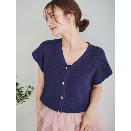 シンプルながらも金ボタンがアクセントになった、Vネックのカーディガントップス。肩が隠れるフレンチスリーブで、二の腕をカバーできるのも嬉しいポイントです。一枚着としても羽織りとしても使えて、幅広いスタイリングに活躍するアイテムです。