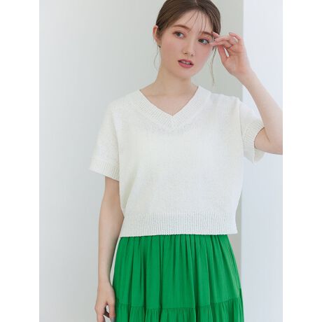 シンプルなデザインで幅広いスタイリングに活躍するVネックニット。清涼感のあるドライタッチ素材を使用しているので、快適に着られるのも嬉しいポイントです。すっきりとしたショート丈で、どんなボトムスとも相性良くスタイリングできるアイテムです。