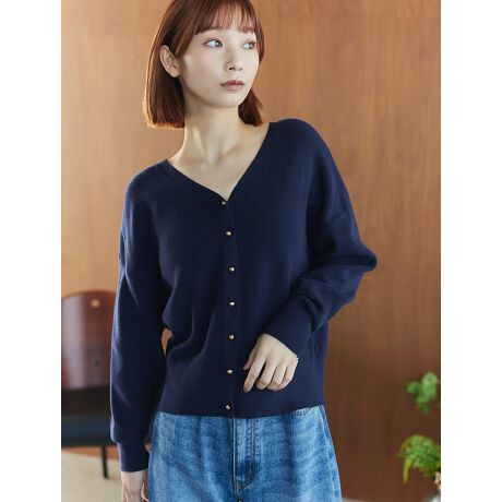シンプルながらもゴールドのボタンがアクセントになったニット。合わせるボトムスを選ばず、幅広いスタイリングに活躍します。Vネックのカーディガンとしても後ろボタンでプルオーバーとしても着用できる2way仕様で、着回し力の高さも嬉しいポイントです。
