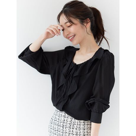 ひらひらとしたフリルカラーがフェミニンな雰囲気を演出するブラウス。フロントネックのスリットに、リボンディテールがアクセントをプラスしてくれます。スカートにもパンツスタイルにも合わせやすく、さまざまなスタイリングが楽しめるアイテムです。
